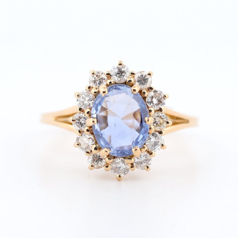 Bague marguerite en or jaune sertie au centre d'un rare saphir de forme ovale de 2.75 carats environ, d'un très beau bleu, et entouré de 12 diamants taille brillant. (mise à taille possible)