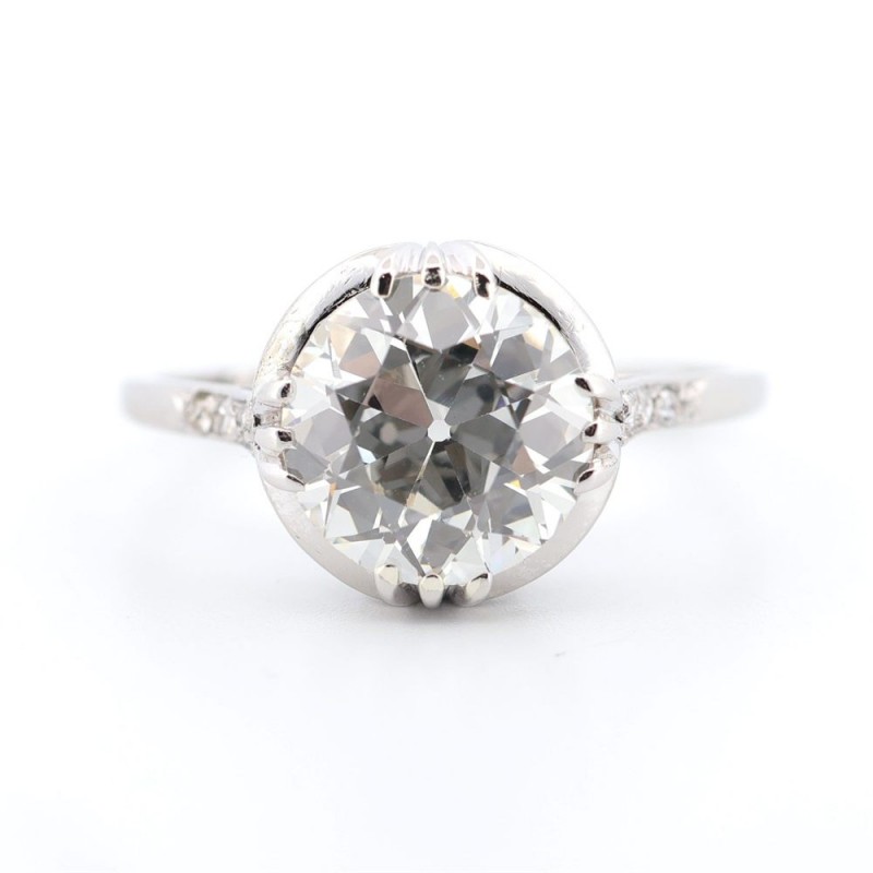 Solitaire en platine serti d'un diamant taille brillant, taille ancienne, de diamètre 8.9mm pour un poids estimé de 2.50 carats environ, de qualité estimée I VS2 ; la monture magnifiquement ouvragée, le diamant serti sur des triples griffes, les palmettes réhaussées de roses de diamants. Présence d'un ressort dans l'anneau.