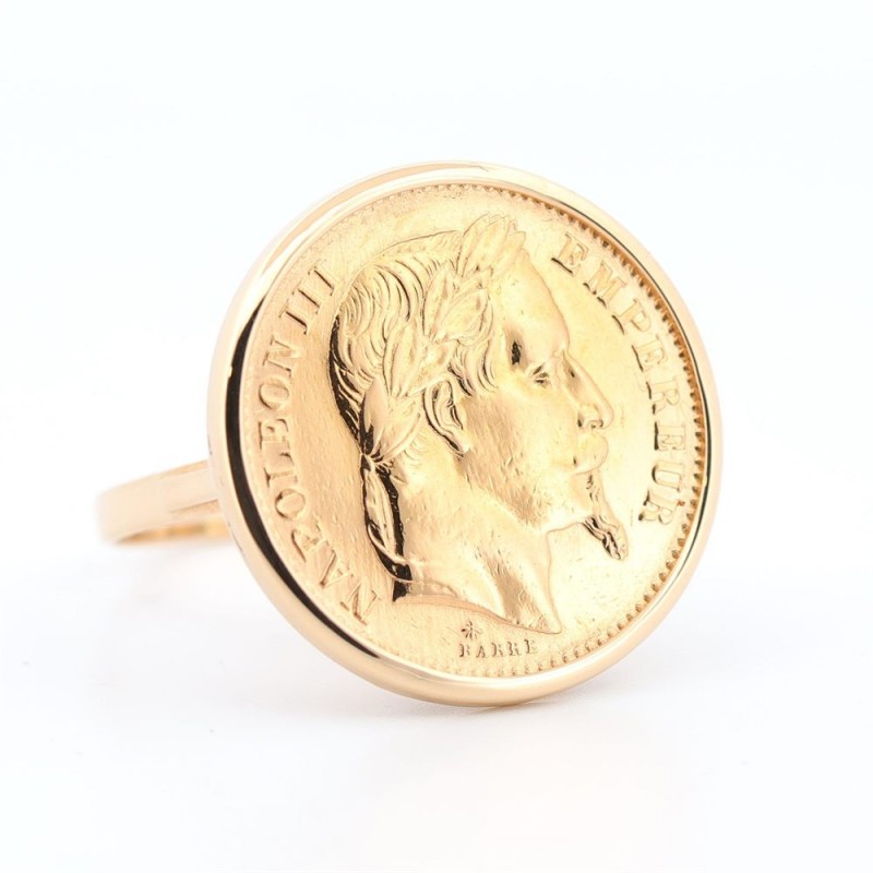 Bague en or jaune porte pièce, sertie d'un Napoléon de 20Fr à l'éffigie de Napoléon III portant la couronne de lauriers. (mise à taille possible)