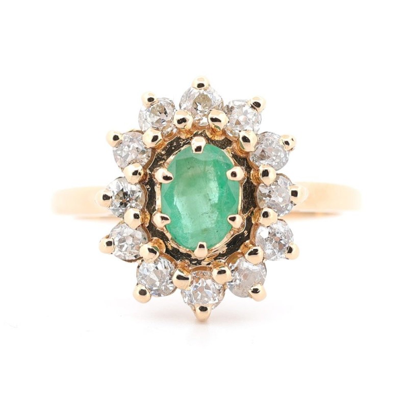 Bague en or jaune en forme de marguerite, sertie au centre d'une ravissante émeraude de forme ovale de 0.50 carat environ, et entourée de diamants taille ancienne pour un poids total de 0.60 carat environ. (mise à taille possible)