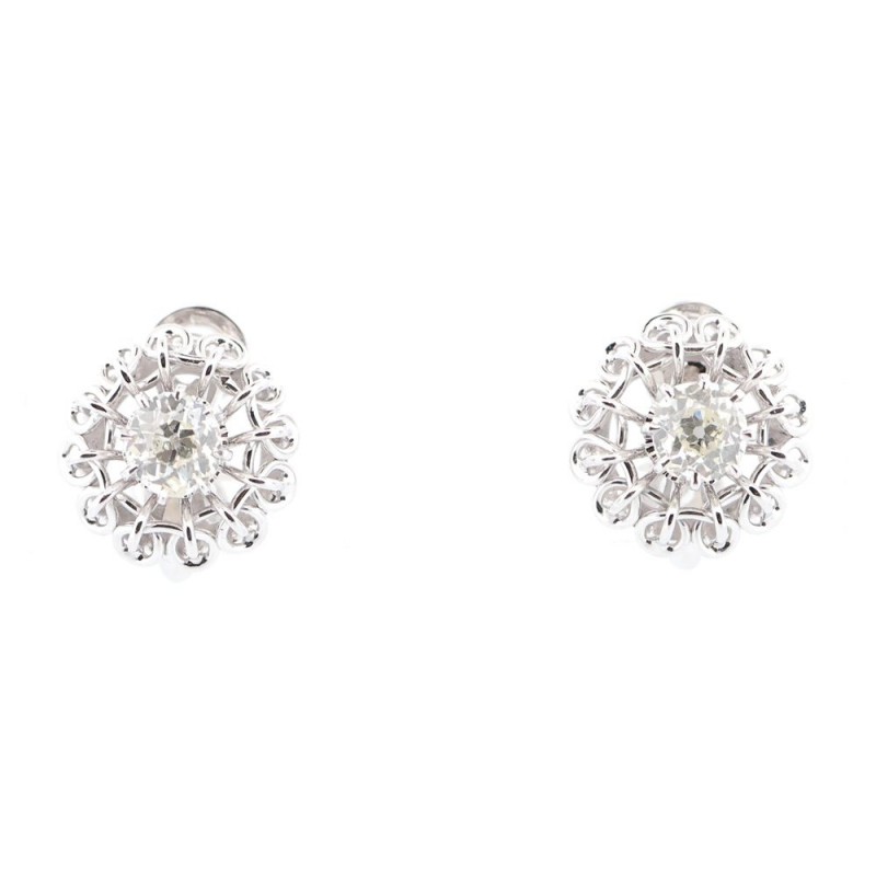Paire de boucles d'oreilles en or blanc Vintage, composée chacune d'un diamant taille ancienne de 0.65 carat environ, dans un entourage de fils d'or entrelacés dans une forme ronde. Sytèmes clips à l'arrière.