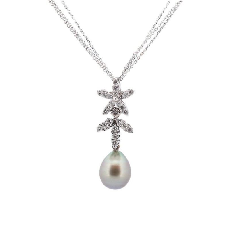 Collier en or blanc composé de trois chaines réunies ensemble se terminant par un pendentif en forme de fleur stylisée entièrement pavée de diamants pour un poids total de 0.78 carat environ, se terminant par une perle de Tahiti en forme de poire, de diamètre 9.5mm. Valeur neuve estimée : 3400 €