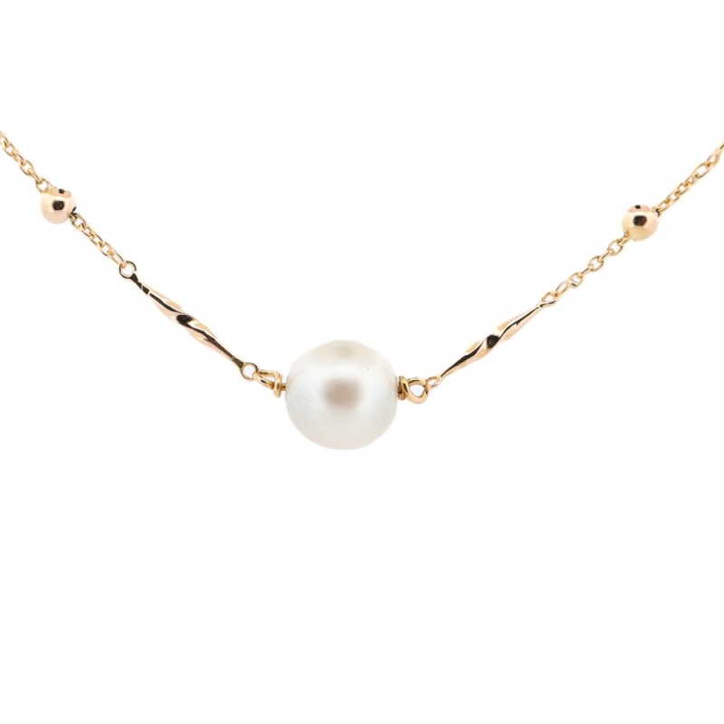 Collier en or jaune ras du cou, orné au centre d'une très belle perle blanche de diamètre 7.5/8mm ; la chaine au motif alterné de tiges tournées et de petites perles en or.