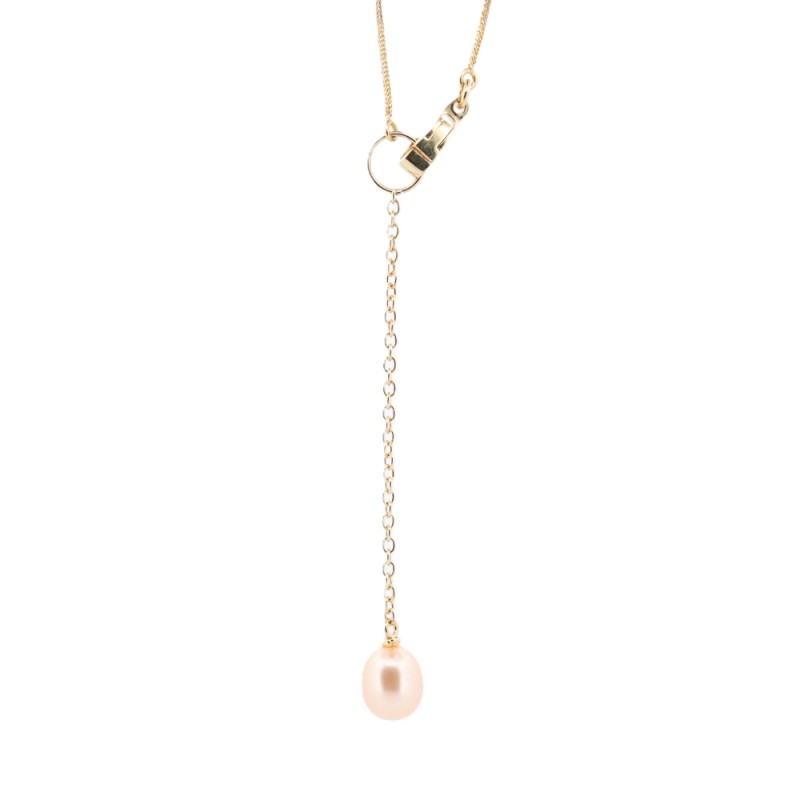 Collier en or jaune, de type négligé, se terminant par une perle rose légèrement en forme de poire.