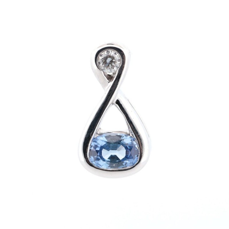 Pendentif en or blanc en forme de goutte, composée d'un saphir de type Ceylan de forme ovale, de 1 carat environ, serti à l'horizontale, et surmonté d'un diamant taille brillant de 0.10 carat environ.